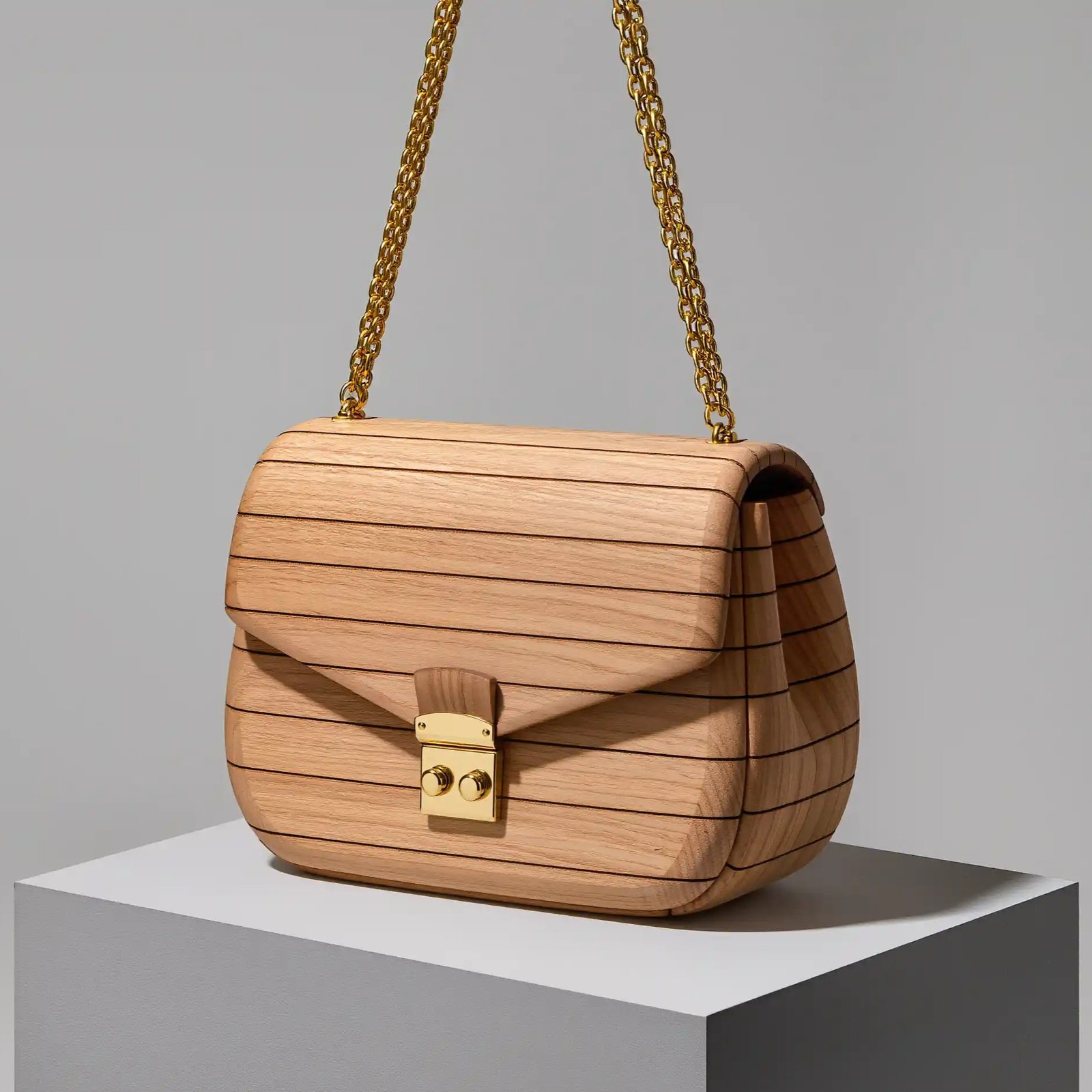 La Borsa Elena rappresenta la sintesi ideale tra design contemporaneo e artigianato naturale. Realizzata in legno chiaro con eleganti incisioni orizzontali, è un accessorio che cattura la luce e la trasforma in eleganza. Le venature sottili e la finitura satinata donano un tocco caldo e raffinato, mentre la catena dorata e la chiusura metallica aggiungono una nota di lusso discreto.